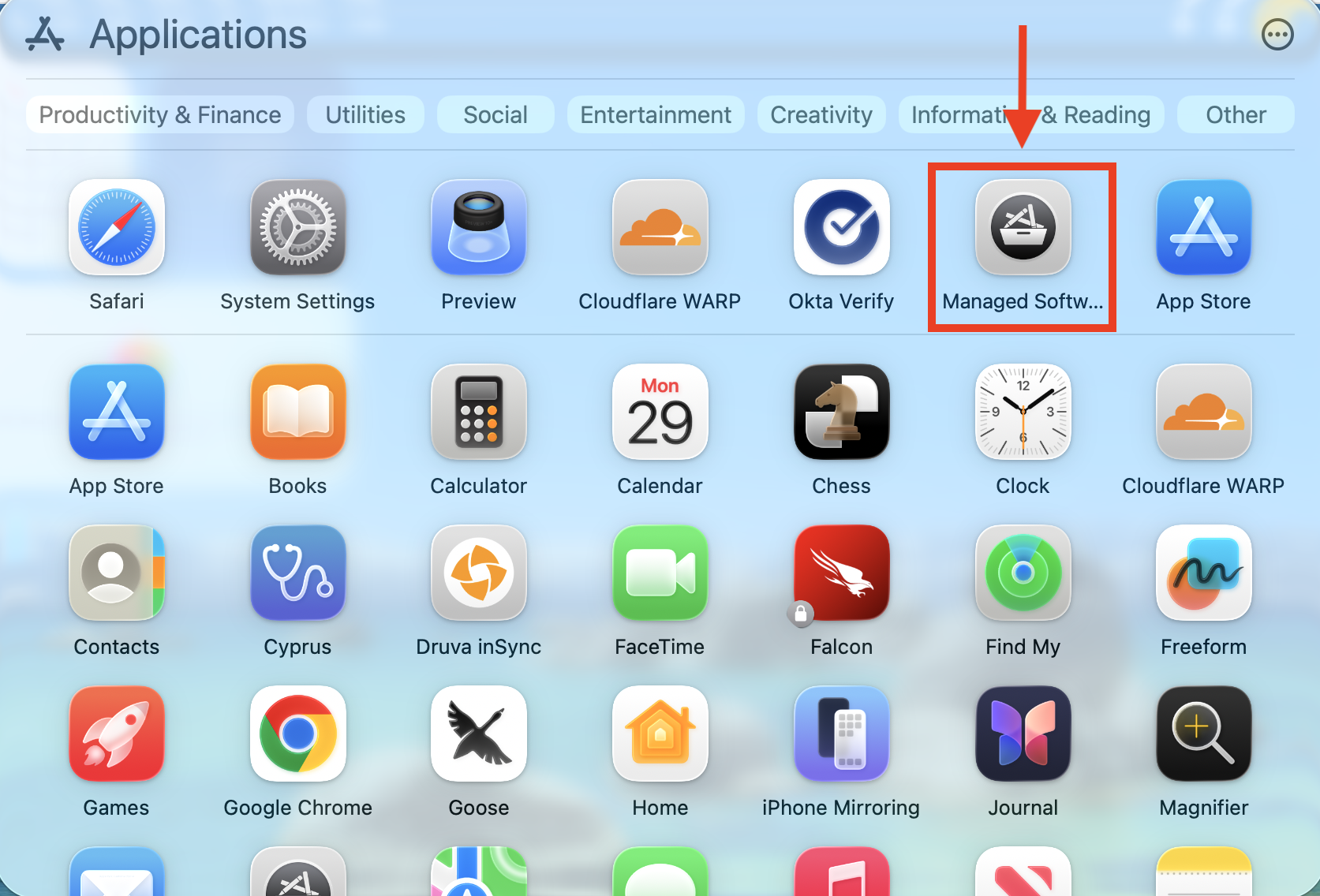 Note: If the Managed Software Center doesn’t open up, Click the Managed Software Center icon in the toolbar. If you don’t see it, please open Apps and click Managed Software Center to manually open it.