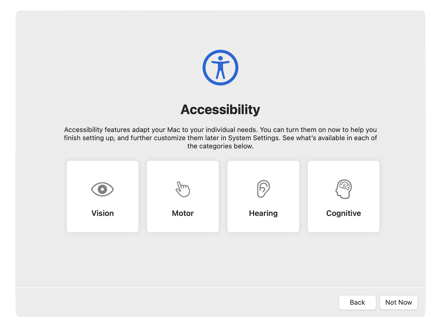 Shortly after boot-up, you will be asked to select your Country or Region, any accessibility options you may require, and preferred language: